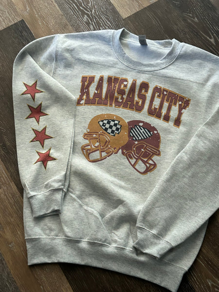 Kansas City helmet design on front of ash gray crewneck sweatshirt
